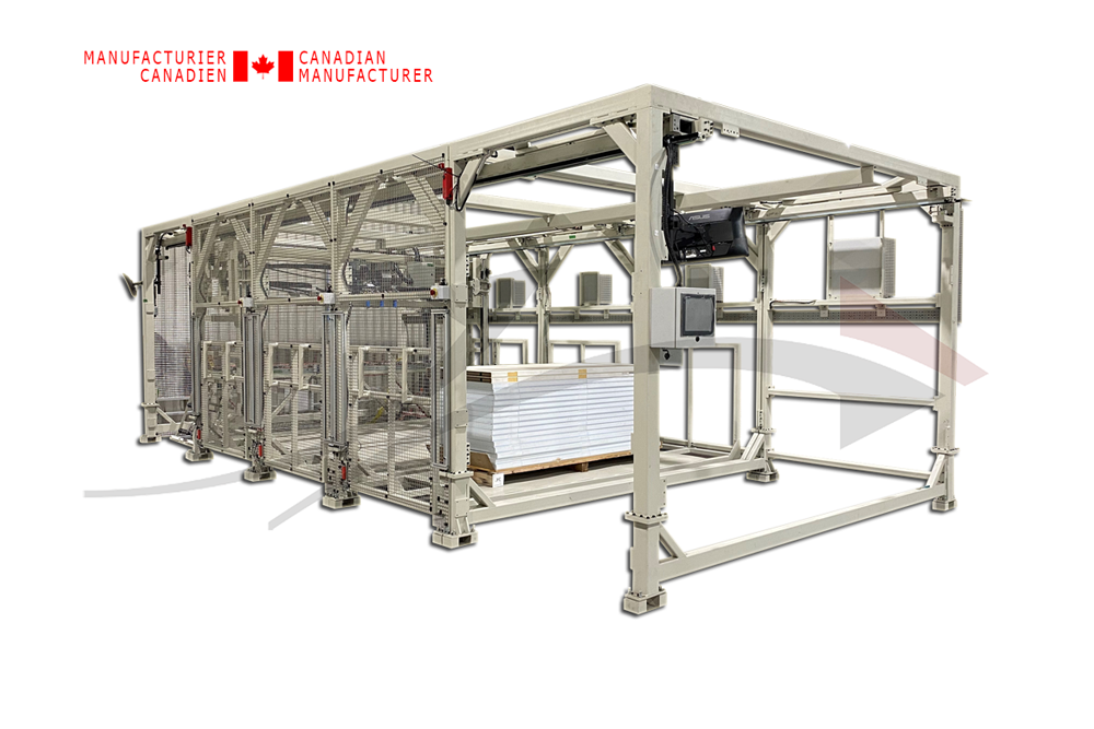 - Mouvement de positionnement 3 axes, incluant 2 lecteurs laser pour le système de ventouse permettant au système de se positionner automatiquement selon l’emplacement des embossures sur les panneaux. Ce même système gère les tolérances des panneaux pour leur positionnement mais aussi sur l’épaisseur.